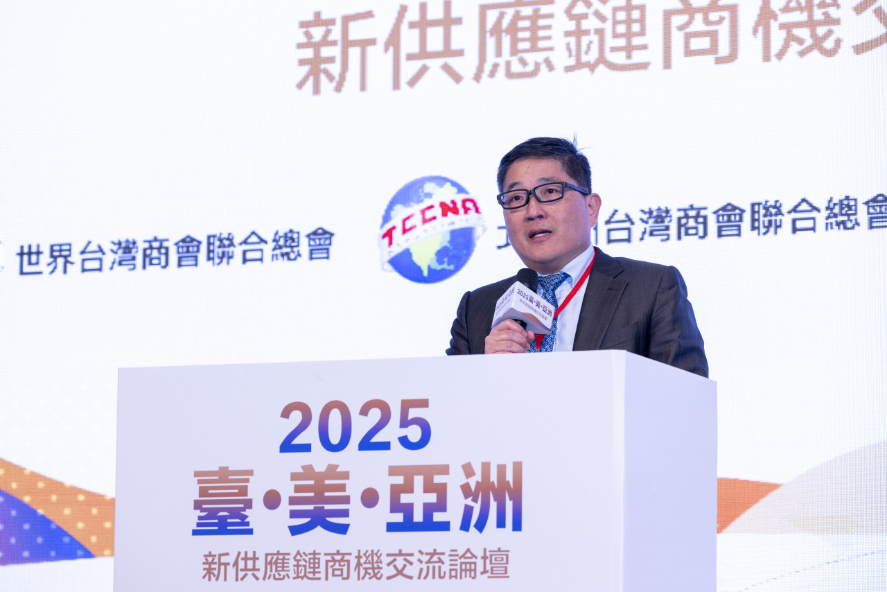 ▲經濟部長郭智輝特地蒞臨擔任開場致詞貴賓,並肯定在座台商的成就,同時也強調,針對美國關稅政策,政府已成立專案服務小組提供即時協助。