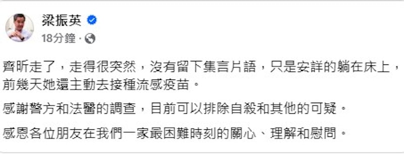 ▲梁振英在社交媒體上證實女兒梁齊昕離世。