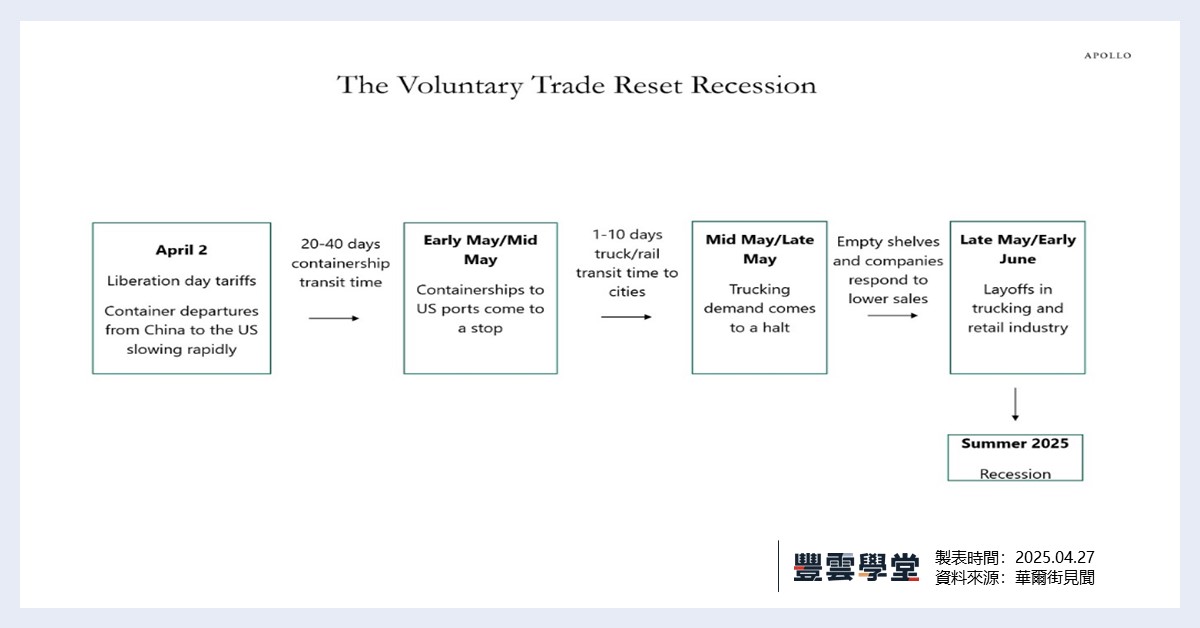 近期私募業者阿波羅全球管理公司首席經濟學家Torsten Slok團隊,展示一份美國進入經濟衰退的時間軸發展路徑,主要的論點在於4月起大規模關稅調整、供應鏈中斷與運輸瓶頸,這一連鎖反應正快速推動美國經濟進入衰退。今天的專欄文章來跟讀者們分享關稅對於美國企業和家庭的傳導影響,學習專業機構的投資思考。