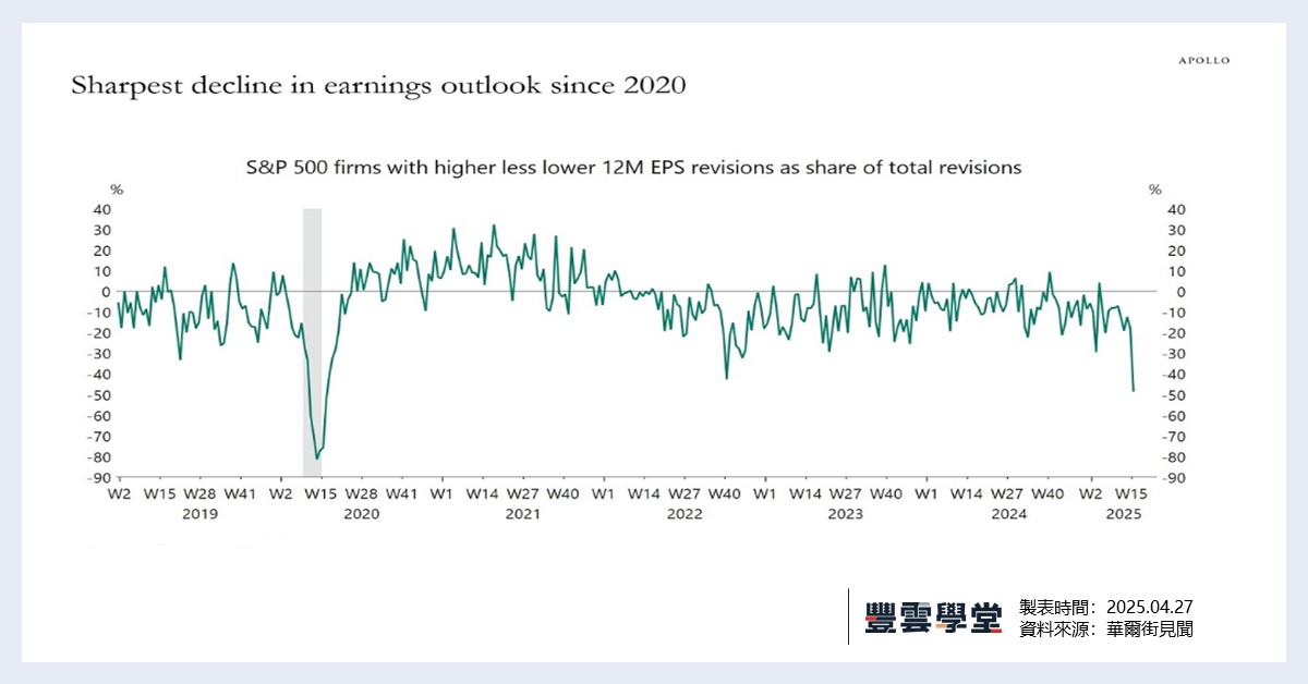 我們在之前的專欄文章川普「朝令夕改」成為股市最大風險,下一個貿易衝突正在發生!法人:止跌訊號觀察3面向,也曾經多次強調,摩根大通表示美國和全球經濟衰退機率高達60%,而川普政府的決策風格極為善變,多次出現「宣布—延後—加碼—暫緩」的政策反覆,這種「朝令夕改」的作風本身就是最大的風險來源,難以建立穩定預期的情況下,市場就難以擺脫高波動狀態,我們可以看到標普500指數公司對未來12個月每股盈餘預期出現大幅度的下降。
