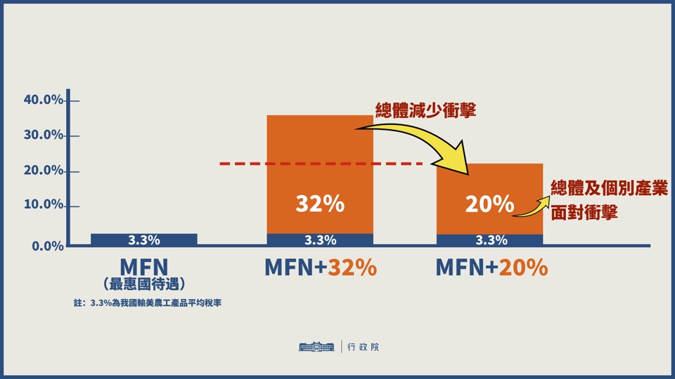 至於我國產品銷美稅率目前究竟該如何計算?鄭麗君解釋,據美方行政命令,我國產品輸美適用稅率以「MFN+對等關稅」方式計算,即產品原稅率加上對等關稅。她解釋,談判期間各國是適用對等關稅10%,後台灣暫時性稅率為20%,以水龍頭為例,原稅率2.6%,新稅率為22.6%(2.6%+20%)。