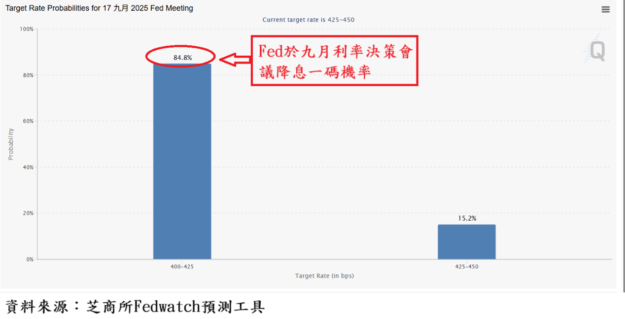 截至8月18日止,根據FedWatch預測工具顯示,9月利率決策會議重新啟動降息機率從7月非農就業報告公告前的68.1%,一度跳升至93.4%,但在7月PPI指數公告數據遠高於預期後,9月利率決策會議降息機率下降至84.8%。