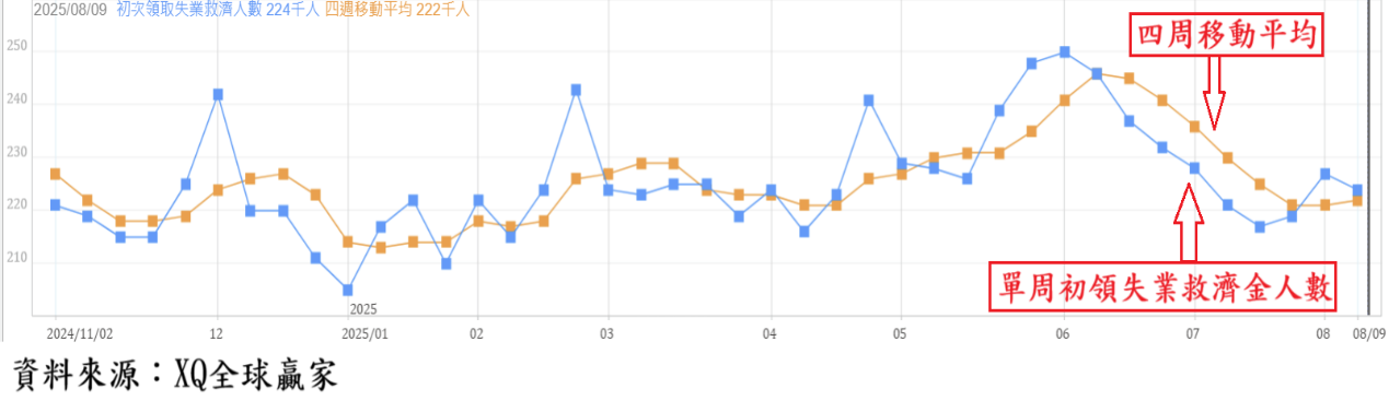 截至8月9日止的美國單周初領失業救濟金人數從前周的22.7萬人小幅下降至22.4萬人,初領失業救濟金四周移動平均與前周的22.1萬人,微幅上升至22.2萬人,仍為長期相對低檔區,顯示短期就業市場數據仍維持穩定狀態。