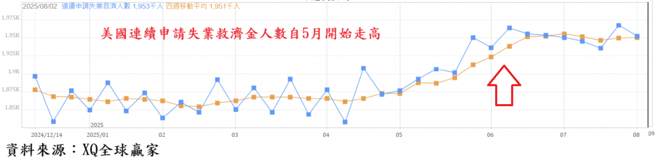 連續請領失業救濟金人數自前周的196.8萬人,下降至195.3萬人,連續請領失業救濟金的四周移動平均,自前周的195萬人,微幅上升至195.1萬人,仍為2021年12月後的最高點附近,顯示長期失業人口潛藏上升危機,尚未解除,隱含就業市場單周初領失業救濟金人數,表面上看似穩定,但長期連續申領失業救濟金人數,實則穩中帶弱,就業市場存在轉弱風險。
