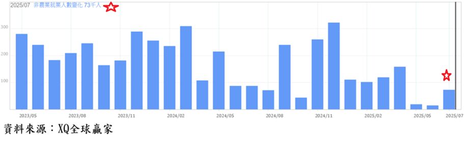 美國7月非農就業人口新增7.3萬人,遠低於市場預期的10.4萬人,並下修前2月新增非農業就業人口高達26萬人,5月新增1.9萬人、6月新增1.4萬人,導致近三個月平均新增就業人數僅3.5萬人,導致市場一度預期聯準會於9月重新啟動降息的機率跳升至九成以上。