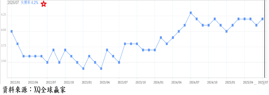 7月失業率從6月的4.1%,上升至7月的4.2%,與市場預期的4.2%相符。7月的非農就業報告,顯示新增非農就業人口數出現成長停滯現象,隱含就業市場可能成長乏力。