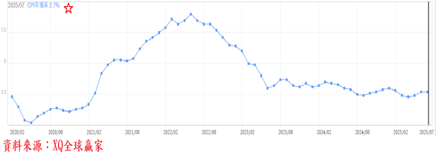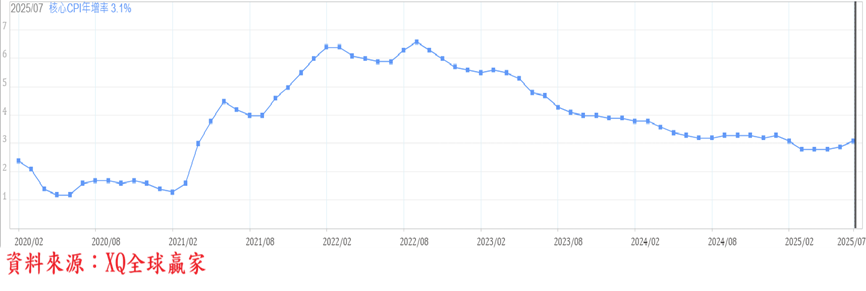 7月核心消費者物價指數(CPI)年增3.1%,高於6月的2.9%,月增率0.3%,稍高於前期的0.2%,但與市場預期相符;7月整體CPI年增2.7%,與6月持平,低於市場預期的2.8%,月增率0.2%,稍低於前期的0.3%,但與市場預期相符。最新物價數據顯示物價微幅緩升,但整體通膨情勢仍維持穩定。