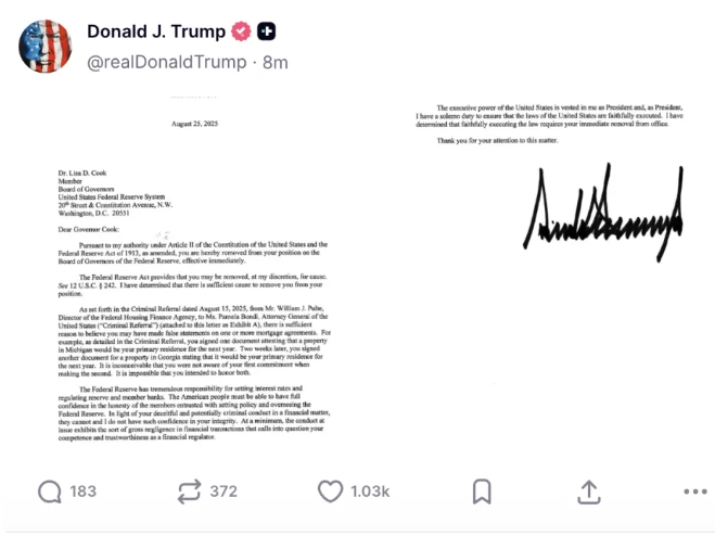 貼文援引美國憲法第二條及 1913 年頒佈的《聯邦儲備法》相關條款,川普表示已認定存在足夠理由撤銷庫克職務。