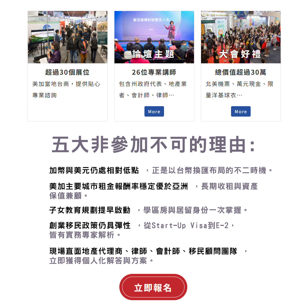 主辦單位《北美洲台灣商會聯合總會》成立於1987年,已有32個會員商會、3,500家以上的台灣企業,在北美洲工商界佔一席重要地位!本次舉辦「美加投資博覽會」,為有意前往美加置產、移民的投資者,搭建與台商交流的機會,邀您深入了解北美市場潛力,把握資產配置與長期發展雙贏機會。