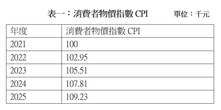 參考表一的台灣行政院主計總處資料分析,以2021年為基期100,2021年到2025年累計平均消費者物價指數分別為100、102.95、105.51、107.81、109.23(截至最新2025年7月底)。