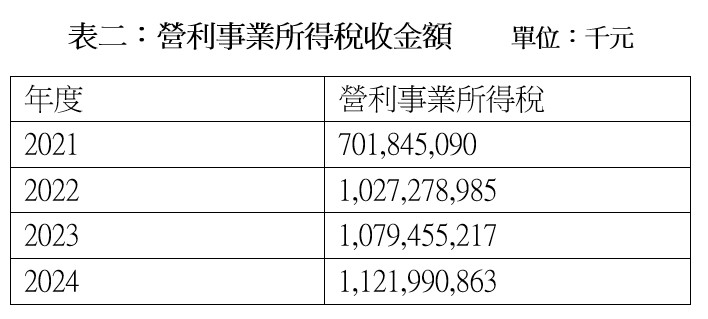 再根據表二的財政部統計資料分析可知,2021年到2024年營利事業所得稅收分別為701,845,090千元、1,027,278,985千元、1,079,455,217千元與1,121,990,863千元,平減物價指數後可知2021年到2024年的營利事業所得稅收分別為701,845,090千元、997,842,627千元、1,023,083,325千元與1,001,257,042千元,平減物價指數後,2024年營利事業所得稅收反較2023年營利事業所得稅收來得少,減少金額為21,826,283千元,顯示平減物價指數後,2023年與2024年的營利事業所得稅收出現「逆轉現象」,也就是說2024年企業平減物價指數後的實際獲利較2023年為少,但卻需繳納較多的營所稅。