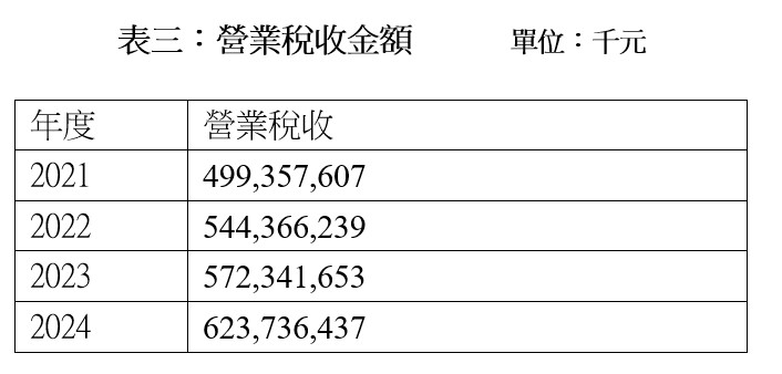 進一步觀察台灣營業稅平減物價指數後的增減變動情形,根據表三財政部統計資料分析可知,2021年到2024年營業稅收分別為499,357,607千元、544,366,239千元、572,341,653千元與623,736,437千元,平減物價指數後,2021年到2024年營業稅收分別為499,357,607千元、528,767,594千元、542,452,519千元與578,551,560千元,顯示物價指數平減前後,各年度營業稅收並未出現「逆轉現象」,主要是由於營業稅是按銷貨金額來課稅,企業不論賺錢還是賠售都要繳納營業稅,因此不致因物價指數平減而發生逆轉現象。