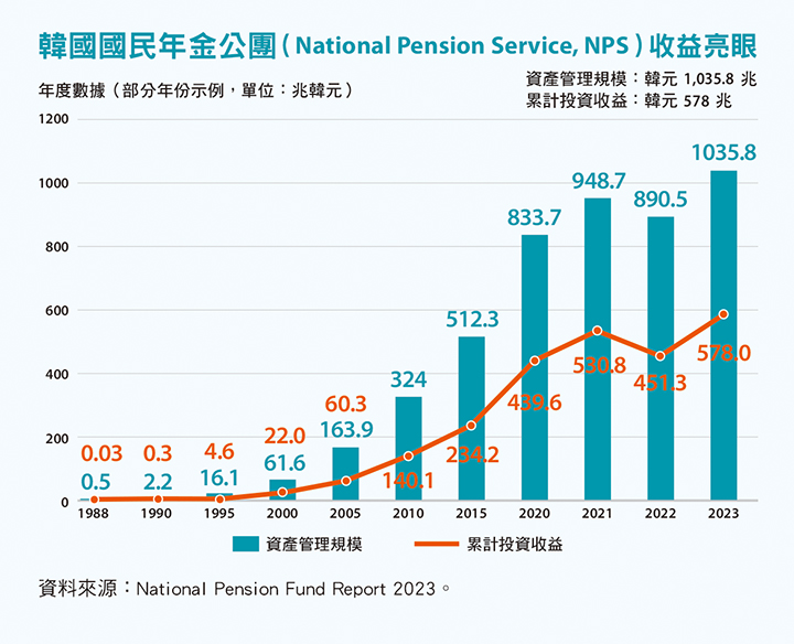 國民年金計畫於一九八八年底實施時,基金規模僅〇.〇三兆韓元。經過三十五年累積,截至二〇二三年底,基金資產已成長至韓元一〇三五.八兆,成為全球最大規模的公共年金基金之一。自成立以來,累計投資收益達韓元五七八兆,約佔資產總規模的五五.八%,效益相當亮麗。