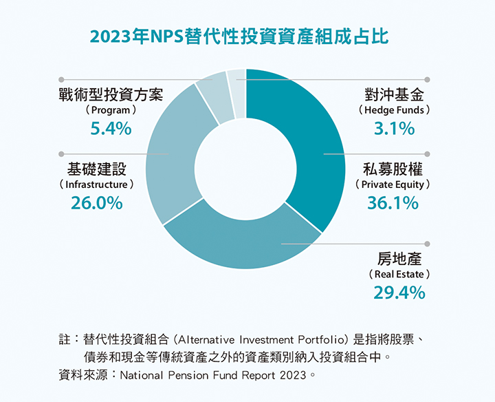 NPS自二〇〇二年以國內創投為起點,開始投入替代性資產。其後投資標的與範圍持續擴大,涵蓋國內外房地產、基礎建設、私募股權、對沖基金等。NPS目前管理的龐大基金中,房地產佔替代性投資組合二九.四%,僅次於私募股權。
