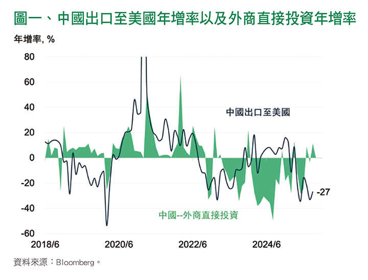 然而,美中後續恐怕無法回到拜登時期那樣「真正」休戰的狀態。中國對美國出口的比重,從去年的一四.六%到了今年第三季末已經降至一〇.四%,隨著美國仍未對中國完全降回過去的關稅水準,預計將進一步下滑。實體貨物貿易的變化,自然會對金融投資產生影響,今年以來中國的外商直接投資產生了大規模衰退(見圖一)。換言之,即使美中對「土豆尼」議題已有一定共識、貿易休戰,但由於雙方經貿持續脫鉤,明年兩國在貿易外的領域仍有進一步衝突的可能。