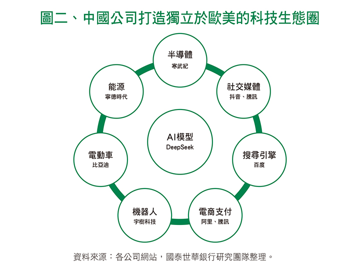雖說目前全球投資人都將目光放在美國科技業七巨頭(Magnificent 7)身上,但其實中國的科技生態圈也已經默默成形(見圖二)。可以預想的是,美中明後年很可能不斷在AI領域發布各種先進發展,表現出進一步對抗的態勢。
