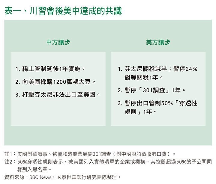 二〇一八年,處在第一任期的川普發動貿易戰,當時最主要的議題,就是稀土、大豆以及芬太尼(簡稱「土豆尼」);歷經了拜登的休戰期後,川普才剛重新執政,就再次針對土豆尼議題啟動貿易戰二.〇。雙方今年談判的最終結果是,暫時先各自讓步,一年後再重新協商。這橫跨了將近十年的貿易戰,可以說是始於「土豆尼」、終於「土豆尼」(見表一)。