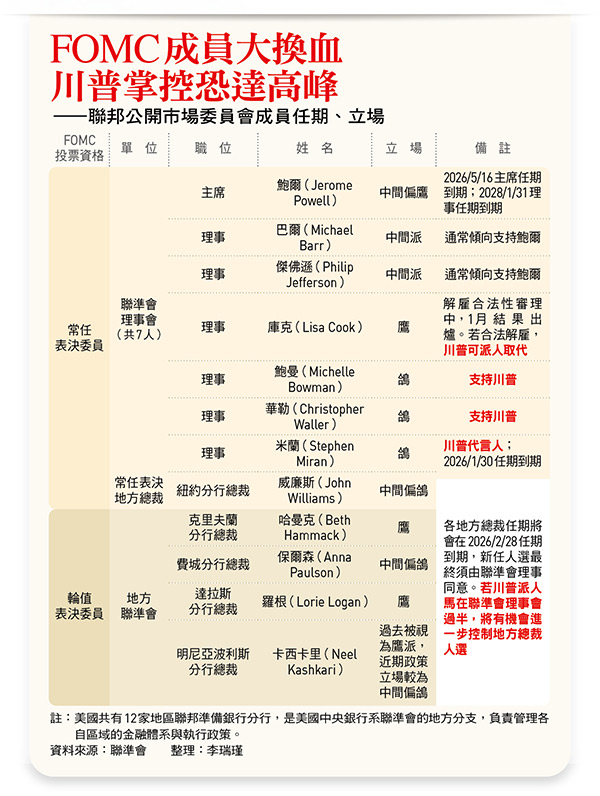 必須留意的是,二六年二月,所有地方分行總裁的任期同步到期,而地方分行總裁的任命(無論新派或是續任),最終都需要聯準會理事會同意後才能生效。富邦金控首席經濟學家羅瑋憂心,若庫克遭合法解雇,聯準會理事會至少有一半都是川普派任的人,他便可控制地方分行的總裁人選,如此一來,即使鮑爾卸任後一改過往慣例選擇「繼續擔任理事」,「川普對利率政策的掌控,仍將達最高峰。」