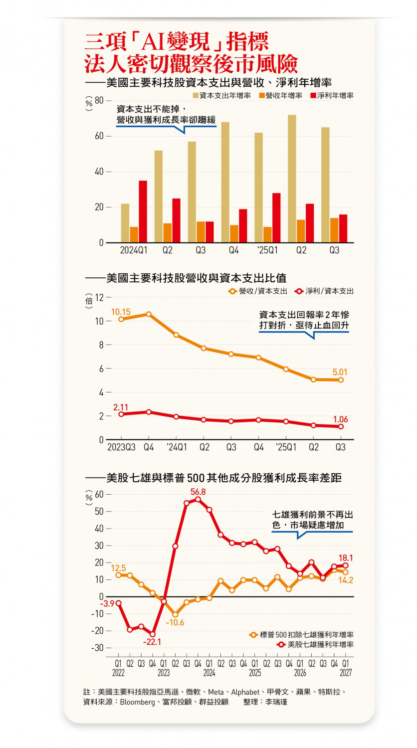 除了終端需求的指標,AI巨頭的變現能力也必然成為二六年市場焦點。富邦投顧董事長陳奕光對此表示,美國主要科技企業(此指:亞馬遜、微軟、Meta、Alphabet、甲骨文、蘋果、特斯拉)的資本支出年增率,自二四年第二季以來,每季維持五成以上的增長率,但營收與獲利年增率卻仍未出現明顯成長趨勢。