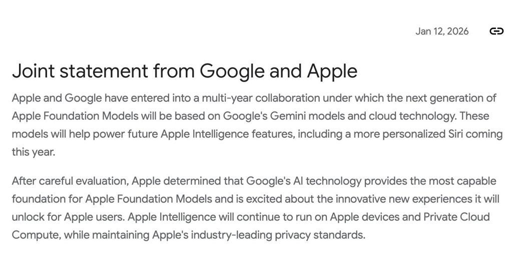 在雙方聯合聲明中指出,「經過審慎評估,Google的AI技術能為Apple Foundation Models提供最強大的基礎。儘管底層模型導入Gemini技術,Apple強調仍將堅守隱私底線,Apple Intelligence將持續在裝置端與Apple自家的Private Cloud Compute上運行,確保用戶數據安全標準不變。」