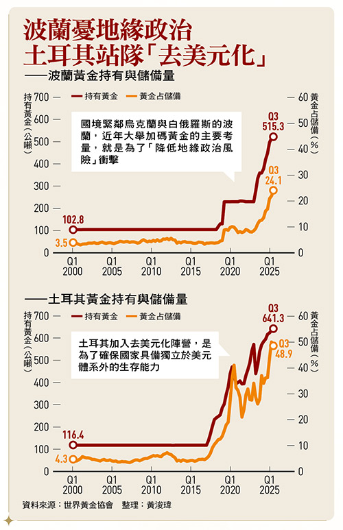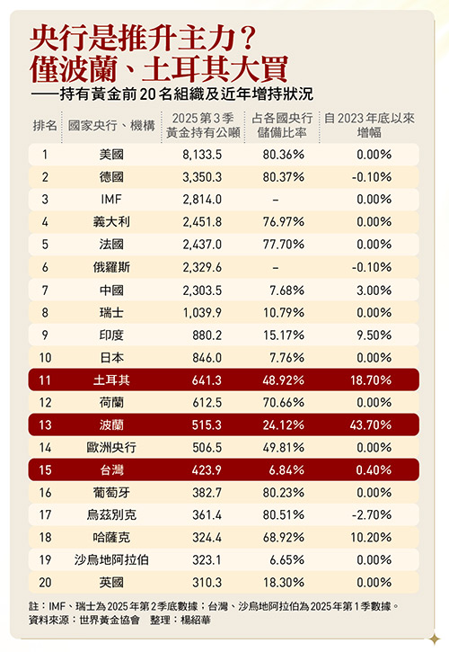 這段歷史,如今也讓緊鄰烏克蘭與白俄羅斯的波蘭,成為二○二五年金價大漲的最強推手之一。根據世界黃金協會(WGC)數據,約莫自二二年第三季開始,波蘭央行就一路大買黃金,從原本的三三三公噸買到近期宣稱的五五○公噸,去年一年的加碼手筆則是一○二公噸,成為加碼黃金最多的中央銀行。