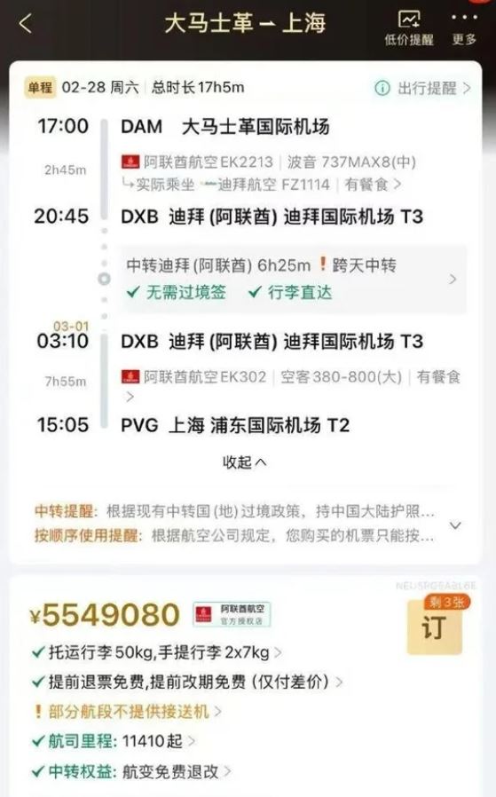 報導也指出,2月28日晚間再度查詢時,當天大馬士革飛往上海的航班已無可售票。3月1日及之後仍有部分航班開放銷售,但價格明顯偏高。