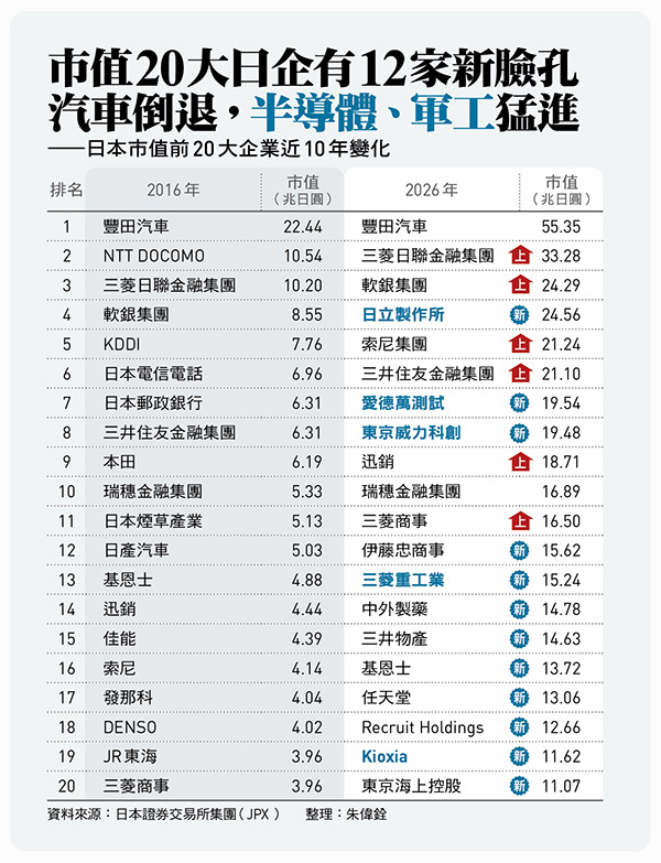 但比較過去10年間東證Prime市值前20大公司排行變化可以發現,日股整體市值雖明顯竄升,企業版圖卻已重新洗牌。日本引以為傲的汽車產業,除了豐田仍穩居市值龍頭以外,本田與日產都已退出榜外,電信、交通運輸等內需產業也大幅退步;與半導體相關的愛德萬測試、東京威力科創,搶進AI基礎建設的日立製作所,則成為新興勢力;傳統五大商社與軍工產業,股價漲勢更是驚人。