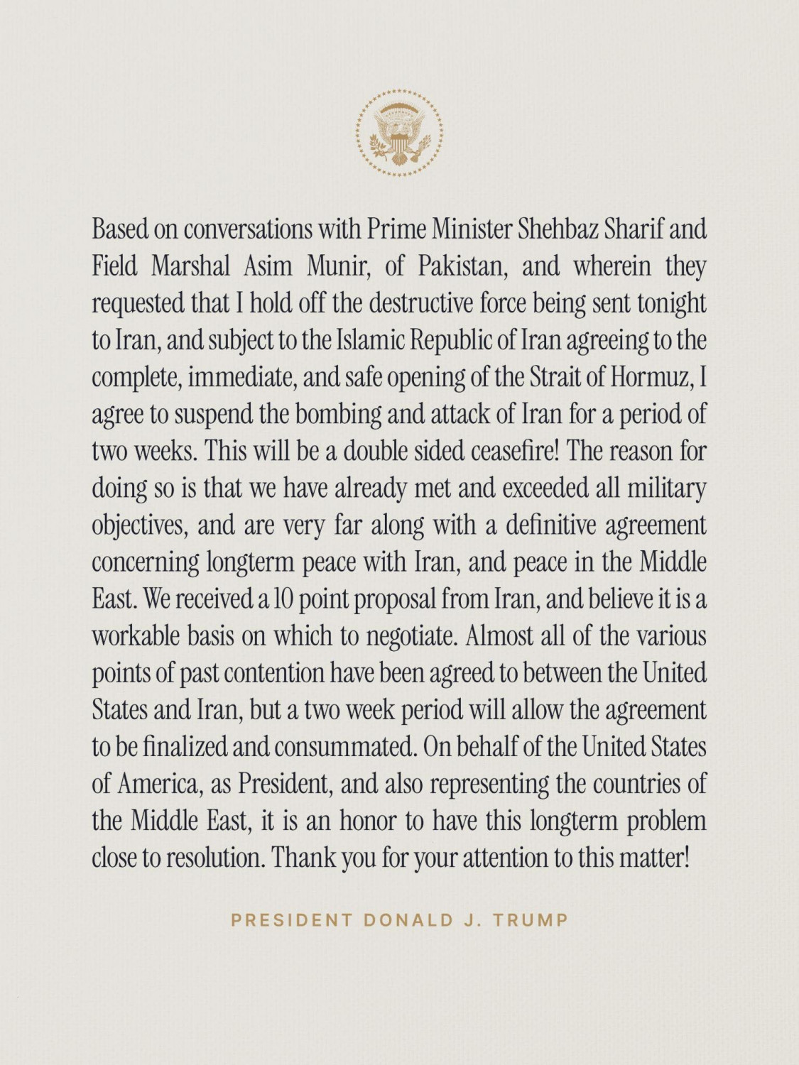 「這樣做的原因是,我們已經達到並超越了所有軍事目標,並且在與伊朗達成長期和平協議以及在中東實現和平方面取得了重大進展,我們收到了伊朗提出的10點方案,並認為這是一個可行的談判基礎」。
