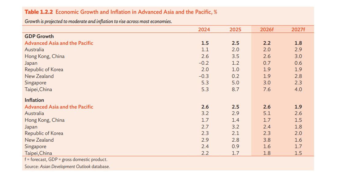 本次報告,亞銀將台灣、南韓、新加坡、香港、紐澳和日本歸類為已開發經濟體,與其他亞太發展中經濟體區隔。亞銀預測,亞太先進經濟體今年的成長將從去年的2.5%放緩至2.2%。