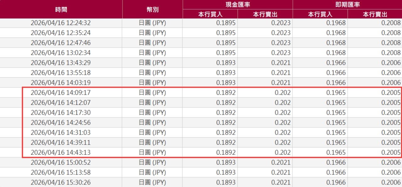 台銀牌告現金匯價中,周四(4/16)下午2時09分日圓匯率一度見到0.202,等於1元台幣可換4.95日圓,為自2025年7月19日以來,近9個月的新低,更讓日圓、日幣匯率等關鍵字再度登上熱搜。