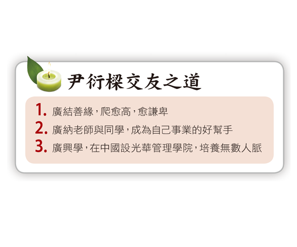 能夠在兩岸遊走,成為中國第一大台商,尹衍樑最擅長「放長線釣大魚」。除了老師、同學或學弟都找來身邊外,他這10多年來,把人脈經營往下扎根,從教育著手,尤其是在大陸,他堪稱「中國第一養士」。