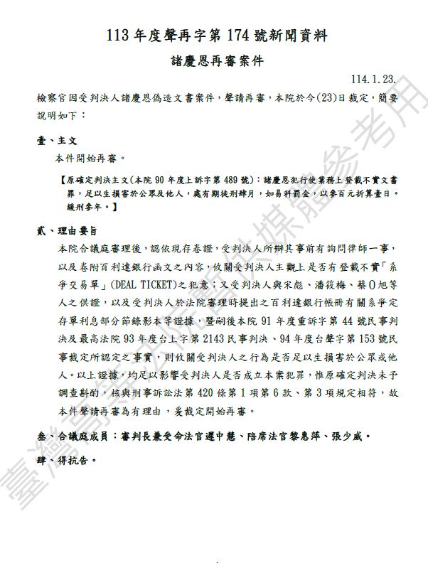 已故前百利達銀行台北分行經理諸慶恩,20多年前向佳和集團負責人翁茂鍾旗下的怡華公司追債,結果反遭控涉違《偽造文書》、《商業會計法》等罪遭判刑,最終含冤而死,迄今無法平反,高檢署認為本案恐有冤情,向高院聲請再審;高院認定有新事實與證據,週四(1/24)裁定開始再審,但全案得抗告!