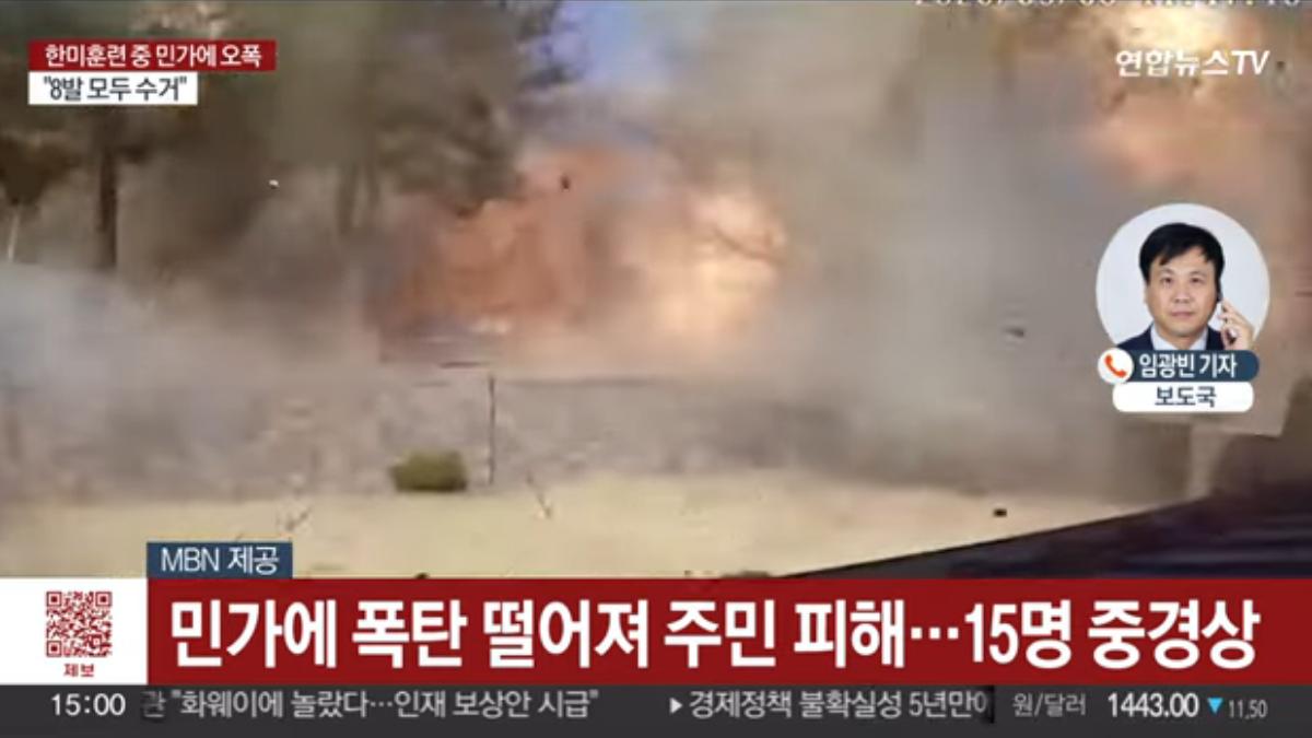 根據韓媒報導,南韓京畿道抱川市今(6)日收到「砲彈掉落」至民宅的報案,據悉,韓美軍演期間,戰鬥機上發射的飛彈誤擊了民宅,擊中位於抱川市魯谷裡的兩棟房屋,其中包括一座教堂和一所民宅,受傷人數增至15人,包括居民和軍人。