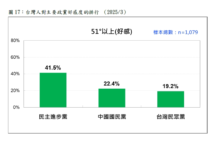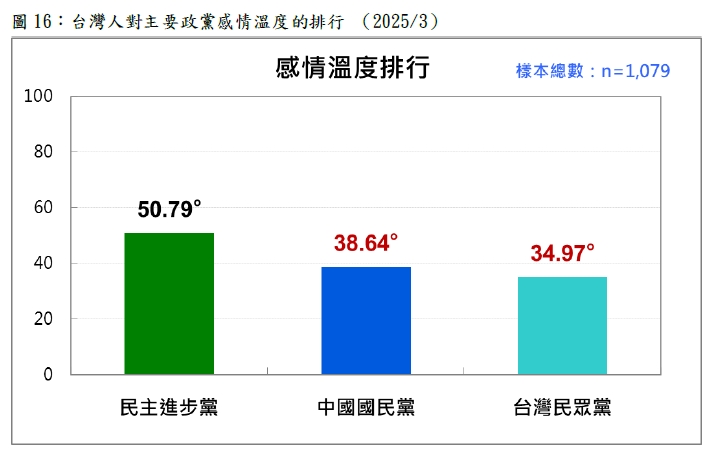 台灣民意基金會3月31日公布國人對3個主要政黨的感情民調。結果顯示,台灣人對民進黨感情溫度為50.79度,是三黨中最高,但有31.6%的人仍對該黨反感。