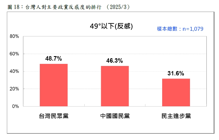 對國民黨平均38.64度,且有46.3%的人對該黨反感、換算後有900萬人討厭國民黨;民眾黨34.97度,是三黨中最低,更有高達48.7%的人對民眾黨反感。