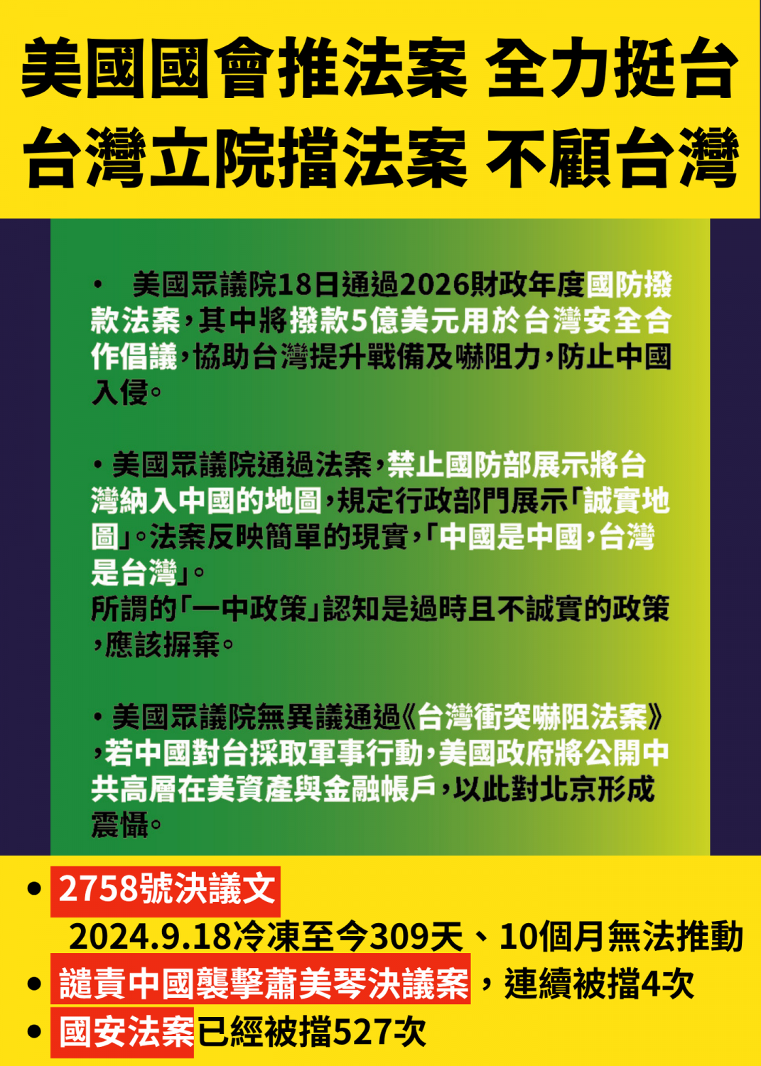 吳思瑤表示,周二院會僅開30分鐘就散會,這個史上最長的延會,但卻無案可審;不過美國國會可沒閒著,像是18日通過2026年財政年度國防撥款法案,其中將撥款5億美元用於台灣安全合作倡議,協助台灣提升戰備及嚇阻力,防止中國入侵,甚至美國官方訴求再加碼,「謝謝美國挺台灣!」