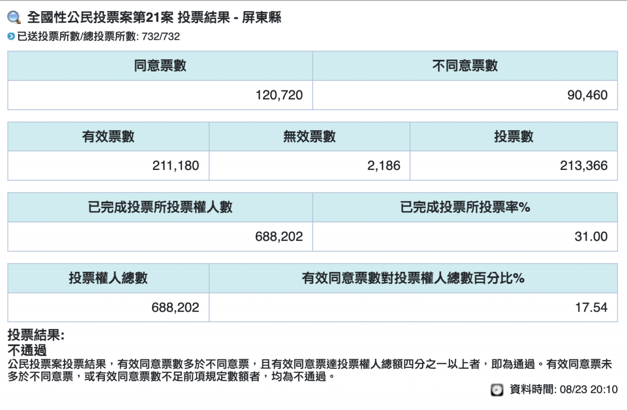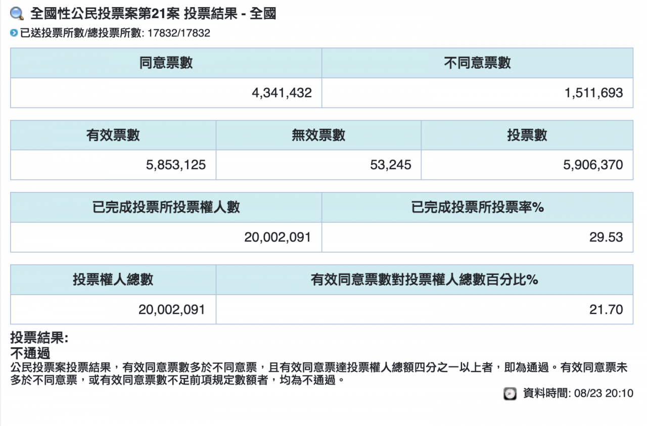 中選會指出,這次投票權人總數為2000萬2091人,投票人數為590萬6370人,同意票為434萬1432票,占74.17%,不同意票為151萬1693票,占25.83%。雖然有效同意票數多於不同意票,但同意票未達投票權人總額1/4以上門檻,因此不通過。