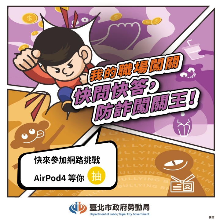 為提升青年族群的求職防詐意識,臺北市政府勞動局於今(114)年特別推出「快問快答,防詐闖關王!」網路互動活動,結合輕鬆有趣的答題方式,帶領民眾快速認識「7不3要」求職防詐原則,並透過闖關挑戰加深記憶,避免落入求職陷阱。
