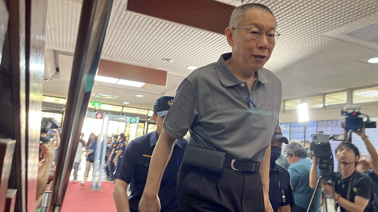 涉及京華城等案的前民眾黨主席柯文哲,這也是柯在週一(9/8)交保後於隔天(9/9)首度出庭,柯文哲一早穿著「KP」深灰色polo衫現身,西裝褲擋住腳上的電子腳鐐。