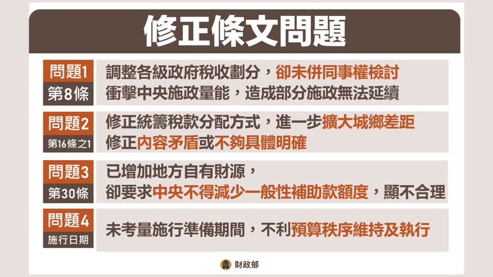 回顧行政院2/27召開記者會,對「財劃法」提出覆議時,卓揆、財政部在簡報時就提出有四大窒礙難行之處:第一,收入劃分未併同事權檢討;第二,「分配公式」擴⼤城鄉差距、內容矛盾、不明確且文字符號缺漏;第三,已增加地⽅自有財源,又要求中央不得減少一般性補助款;第四,新法未考量施⾏準備期間。