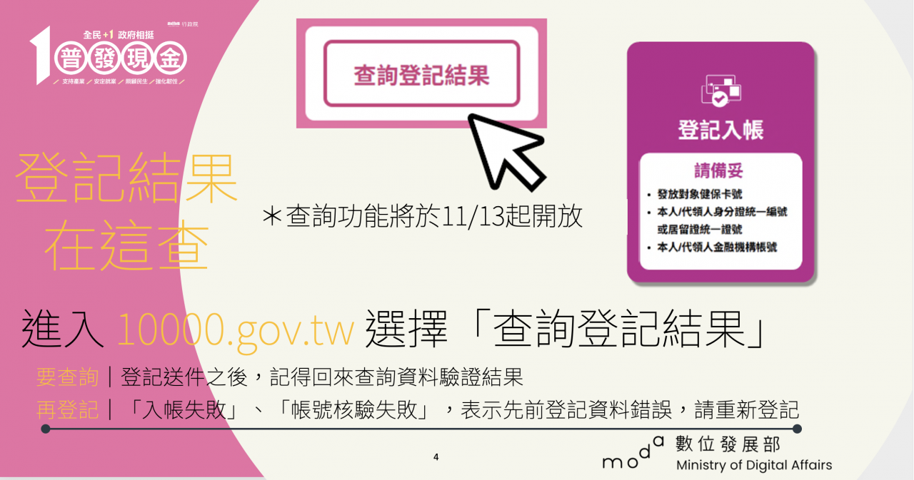 普發現金登記網站公布週四(10/23)公布,網址為https://10000.gov.tw,11/5開放為期5天預登記,11月10日開放登記,11/12開始入帳。