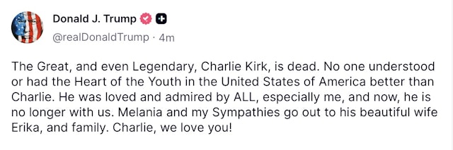 川普在Truth Social發文公布查理柯克的死訊。特朗普表示:「偉大的,甚至是傳奇的查理柯克去世了。沒有人比查理更了解美國青年的想法。他深受所有人的愛戴和敬佩,尤其是我,而如今,他已不在我們身邊。梅蘭妮亞和我向他美麗的妻子艾莉卡和家人致以深切的慰問。查理,我們愛你!」