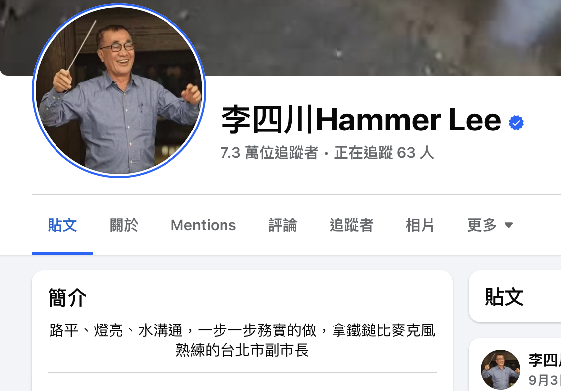 ▲ 李四川的臉書自介強化自己「拿鐵鎚比麥克風熟練」的務實特質。圖/李四川臉書