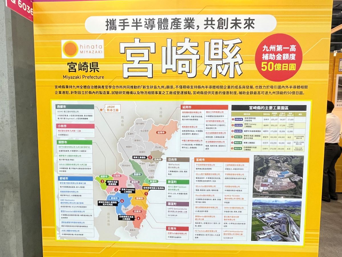 根據宮崎縣攤位工作人員的說法,隨著台積電落腳熊本,帶動不少台灣供應鏈進駐熊本縣或福岡縣,同樣與熊本接壤的宮崎縣,希望從台積電帶動的投資外溢效應中獲益,吸引潛在的台灣半導體供應鏈考慮投資宮崎。