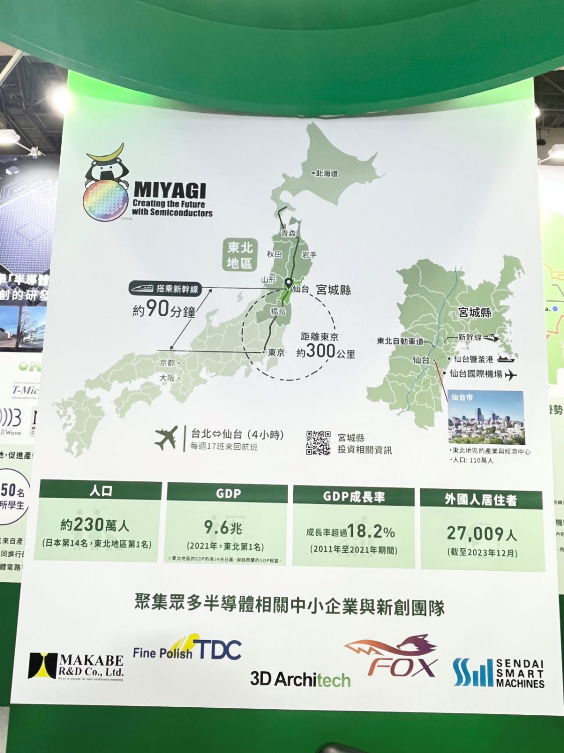 在京都之外,其他第一次參展的地方縣市也有備而來,例如在東北地方的宮城縣租下不小攤位,以放大輸出的背板說明宮城縣的地理位置、當地半導體供應鏈、土地選擇及優惠稅負方案,更結合理工強校東北大學,凸顯本身的人力及教育優勢。