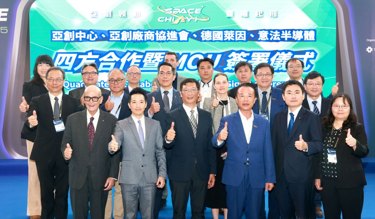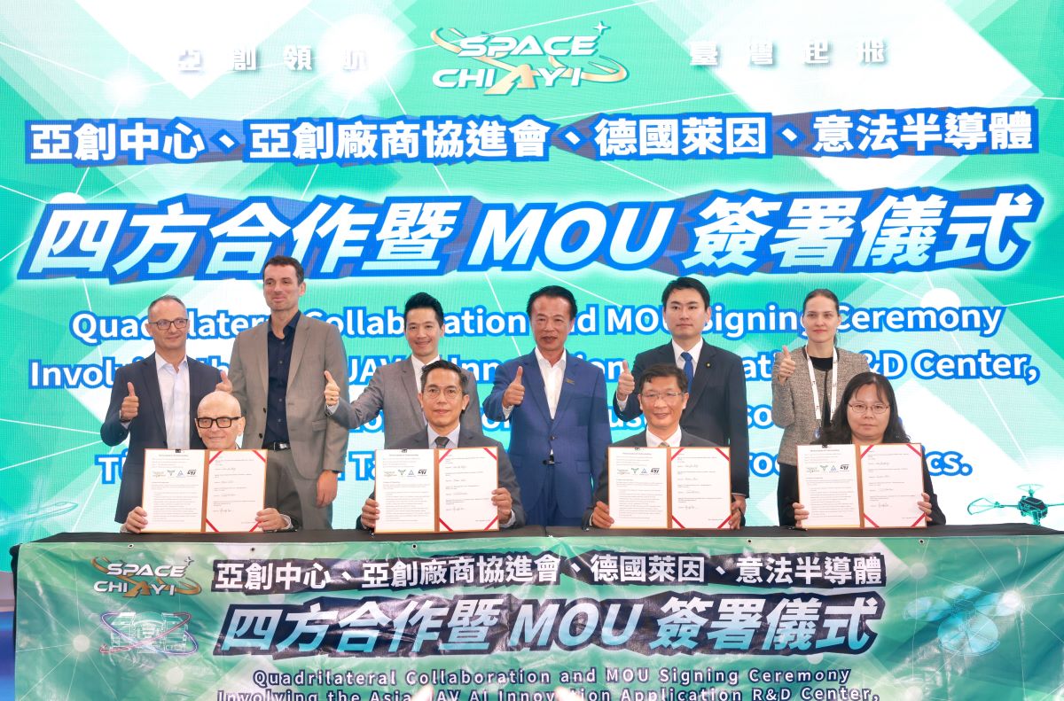 亞洲無人機AI創新應用研發中心(亞創中心)、亞創廠商協進會、德國萊因(TÜV Rheinland)及意法半導體(STMicroelectronics)舉行四方合作備忘錄簽署儀式,由嘉義縣長翁章梁、總統府何志偉副秘書長、歐洲經貿辦事處經貿組邵恩博(Christoph Saurenbach)組長、德國經濟辦事處蘭依樺(Eva Langerbeck)處長、法國在台協會杜鵬(Cyril DUPONT)策略事務顧問見證。