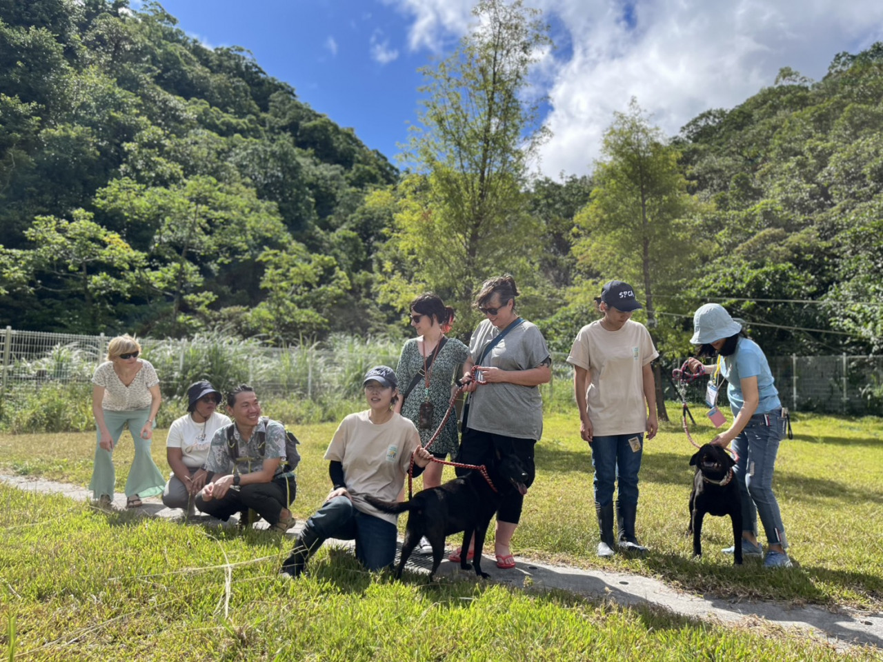 國際訪團在瑞芳動物之家戶外空間與犬隻互動,體驗新北市動保設施兼具溫度與專業。