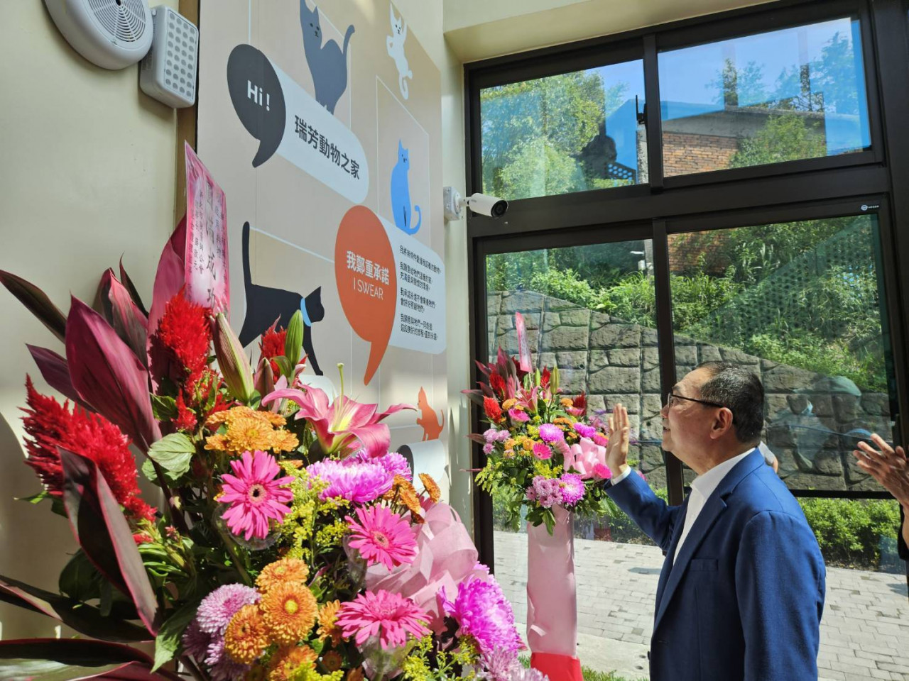 新北市長侯友宜於瑞芳動物之家「誓言牆」前宣示愛護動物理念。