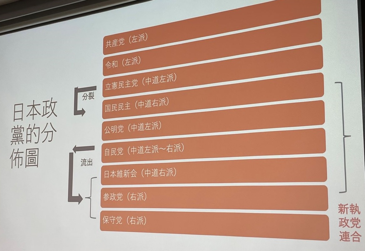 「自民黨與公明黨這兩個政黨,在日本國會已經沒有辦法掌握過半(席次),所以下個國會選舉,自民黨一定要跟幾個小黨聯盟,不管是國民民主黨、日本維新會、參政黨或保守黨。」