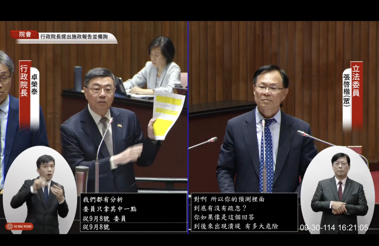卓揆聽聞後加入戰局,反批張啓楷「只知其一不知其三」,他強調政府的分析包括自然溢流、颱風、大雨、地震等多種情境,「從9月8日到29日,長達七整頁的通訊資料都在告訴大家要提高警覺」。